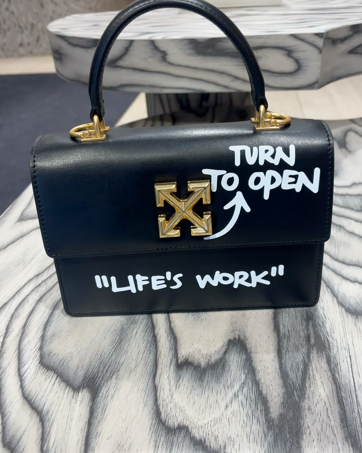 Logolu omuz çantası, ön kısmı ikonik Arrows (Oklar) logosuyla süslenmiştir. Tamamı el yazısı stilinde Quote (Alıntı) detaylarıyla kaplıdır. Tek yuvarlak üst sap, mıknatıslı tokalı kapak, iç cep ve çıkarılabilir omuz askılarına sahiptir.
